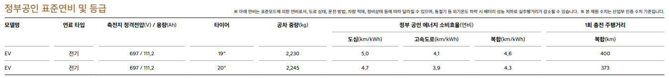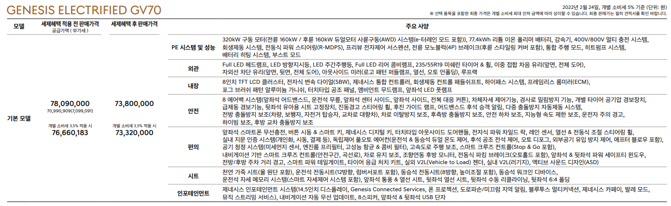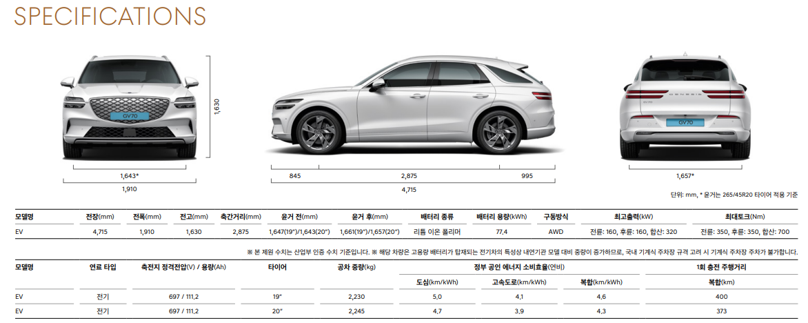 제네시스 공식 홈페이지에 나와있는 Electrified GV70의 스펙은 다음과 같습니다.