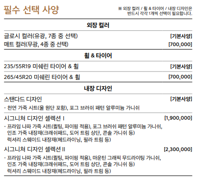 기본 모델의 필수 선택 사양에서 변경할 수 있는 사양은 매트컬러(무광), 휠&타이어, 내장디자인 등이 있습니다.