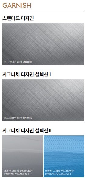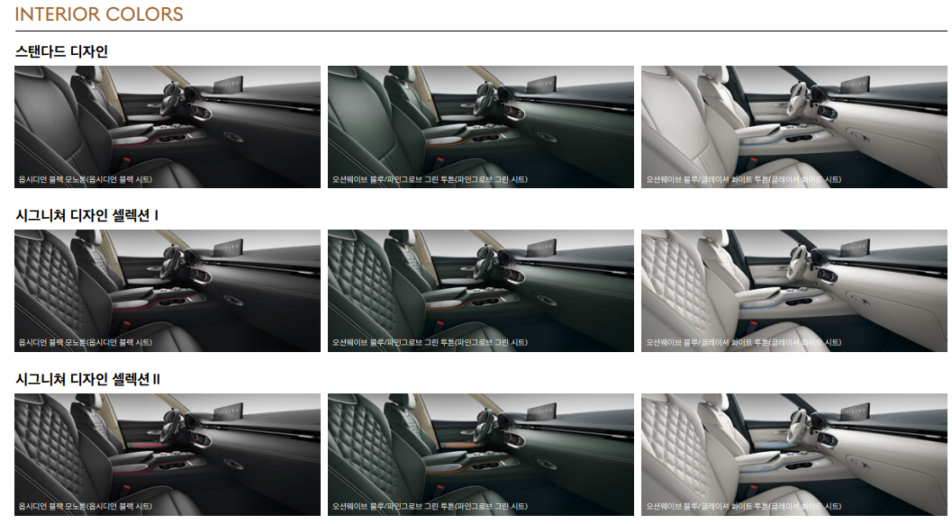 내장 디자인 옵션을 아래와 같이 3가지로 구성되어 있으며, 스탠다드는 기본으로 들어가는 디자인이며 시그니쳐 디자인 셀렉션은 순서대로 190만원, 230만원의 옵션비가 추가됩니다.